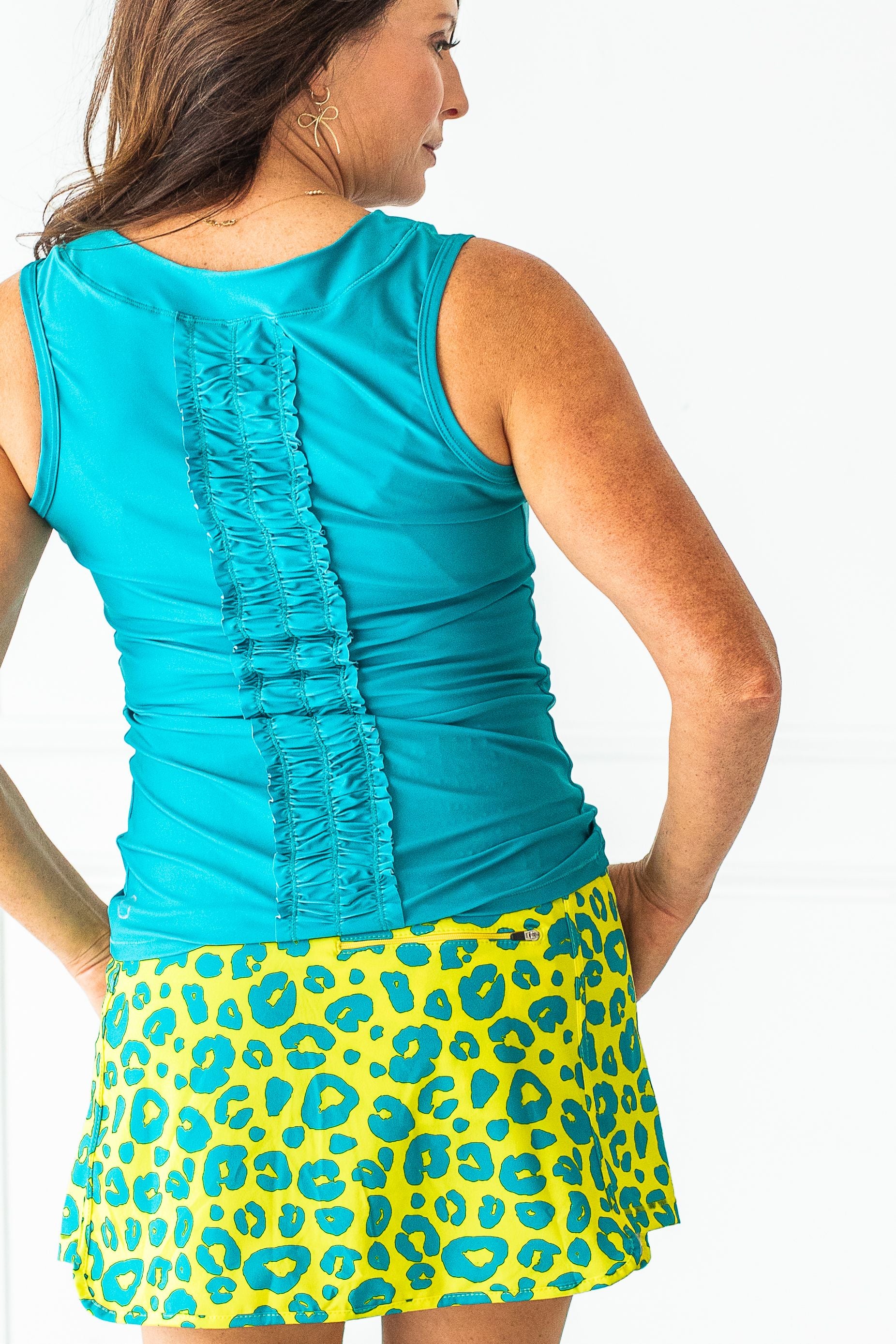 Our take on a tennis tank, the Lexi is the perfect mix of sassy and sweet. With its lower neck line and a ruffle down the back, this shirt is perfect for on and off the court. Its light weight, UPF, moisture wicking, and was made for performance. Available in kids' sizes.